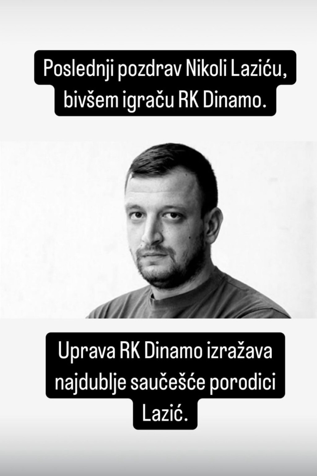 Obaveštavamo sportsku javnost da je posle kratke i teške bolesti preminuo bivši igrač RK Dinamo – Nikola Lazić. Nikola je igrao u našem klubu u dve sezone, gde je ostavio veliki trag i posle koje je svoju karijeru nastavio u španskoj Asobal ligi, odnosno u ekipi Granoljersa.Osim Dinama i Granoljersa, Nikola je igrao za Radnicki Kragujevac, Partizan, Crvenu zvezda, Vilja de Arandu, madjarski Balmazujvaros. Posle Madarske seli se u Rumuniju te igra za CSM Satu Mare i Minaur Baja Mare da bi otisao u Tursku i zaigrao za Batman. Igrao je u Africi za El Macerem Mahdiju (Tunis) i libijski Itihad. U Izraelu je igrao za Hapoel Ber Sevu i Makabi Arazim Ramat Gan a u Srbiji je ponovo nastupao za ekipu sa Uba i Proleter.Datum i mesto sahrane biće naknadno objavljeni.Neka mu je večna slava.