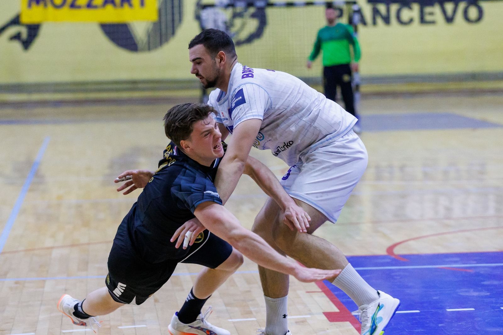 Veliki broj Pančevki i Pančevaca prisustvovao je derbiju, a svi koji su večeras bili na Strelištu imali su šta da vide. Sve do polovine prvog poluvremena vodila se igra gol za gol, a a onda su momci koje predvodi trener Janevski dodali gas. Morao je David Rašić, strateg gostiju, da reaguje tajm-autom u 22. minutu, pri rezultatu 15:11, ali nije vredelo. Iako su do tada Čabrilo i Feješ bili u glavnim ulogama, centralno mesto na sceni zauzeli su drugi momci u crnim dresovima. Andrej Petrić je fenomenalno asistirao Iliji Bogdanoviću, a onda je pivot Dinama lobovao golmana Šapčana i povisio na 16:12. Već u sledećem napadu, uloge su bile obrnute. Sada je Ilija bio asistent, a Andrej egzekutor – 17:12. Zbog oštrog starta Bogdanović je zaradio crveni karton, ali nije to omelo domaći tim. Pravovremeno je trener Janevski reagovao, zatražio je tajm-aut, ali njegov tim je nastavio u istom ritmu. Marko Tasić je pravovremeno reagovao u odbrani, Čabrilo je pogodio za 18:12, a gosti su ipak uspeli da smanje zaostatak pa su na veliki odmor otišli sa minus 4.